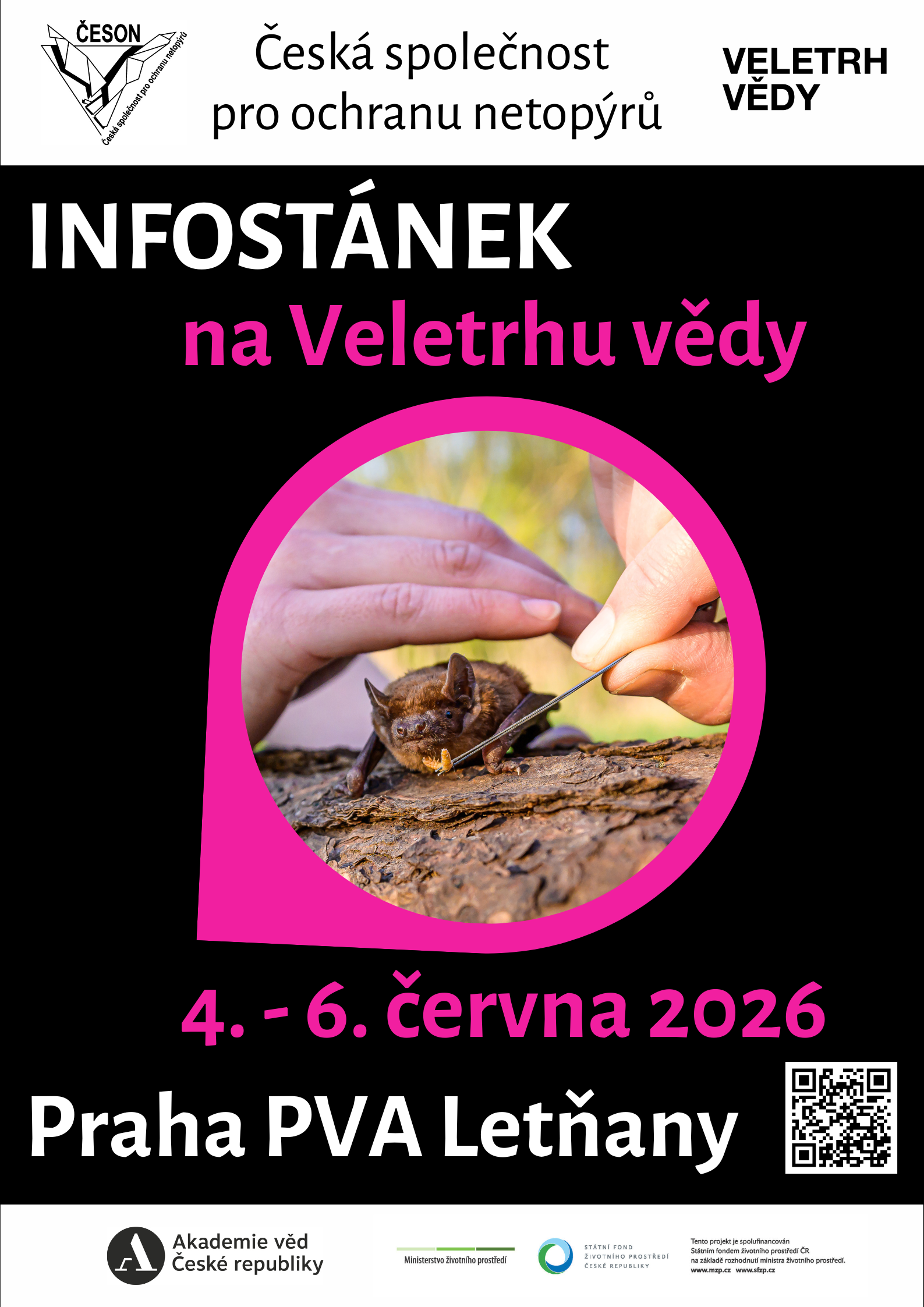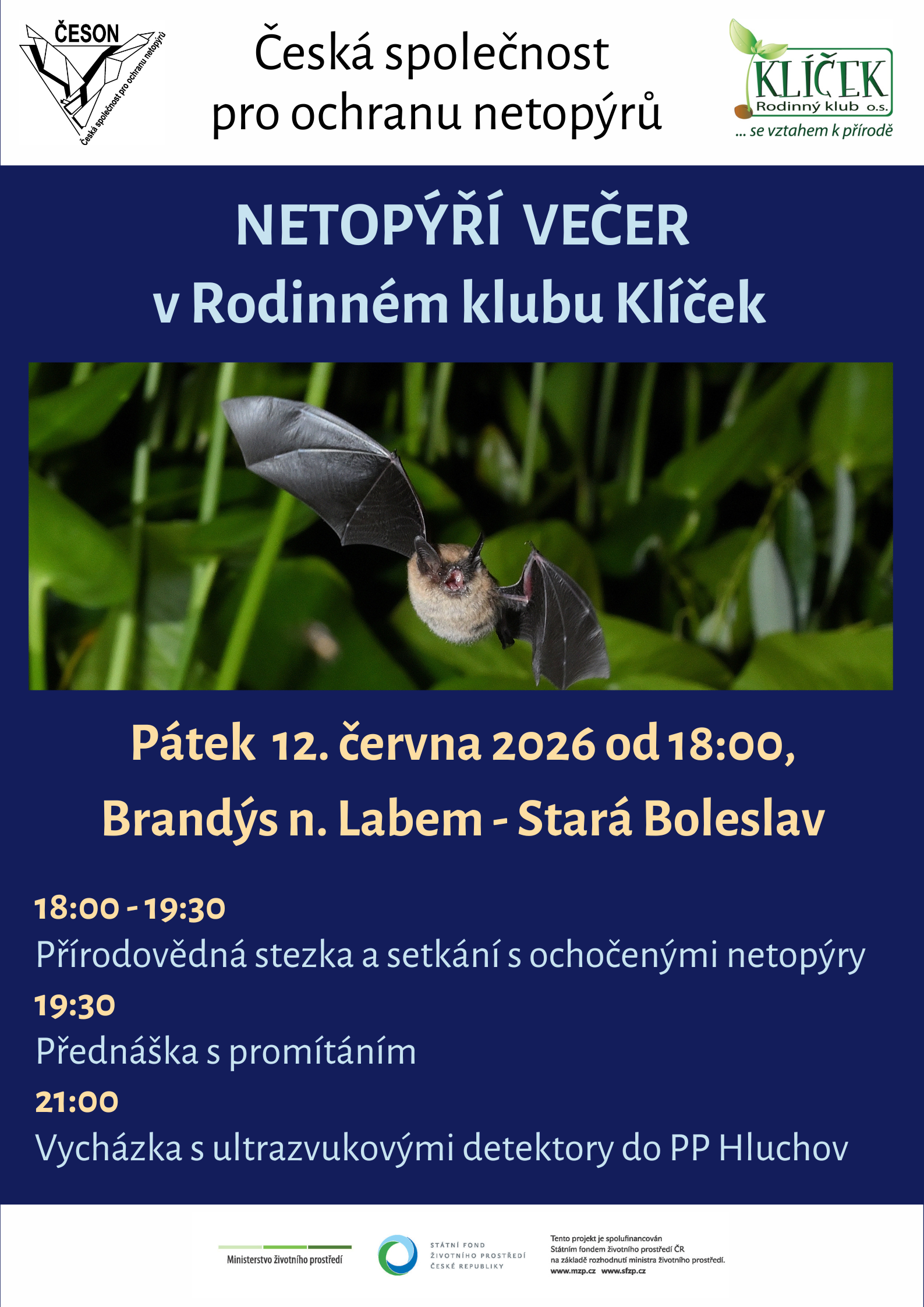 Kalendář akcí Netopýří večer ve Staré Boleslavi [12. června 2026] Srdečně zveme v pátek 12.6.2026 na akci v rodinném klubu Klíček ve Staré Boleslavi. Na zahradě bude připravena přírodovědná stezka, kde si pomocí zábavných úkolů objasníme zajímavosti ze života netopýrů. Setkáte se zde také s ochočenými netopýry. Následovat bude promítání na zahradě s přednáškou. Před setměním se vydáme na vycházku do blízkého lesa (PP Hluchov) s ultrazvukovými detektory, které nám pomohou netopýry sledovat a určovat jednotlivé druhy. Podrobnosti v pozvánce. Pozor: na akci je nutné se předem registrovat na tomto odkazu. Akce je součástí projektu spolufinancovaného SFŽP ČR na základě rozhodnutí ministra životního prostředí. Netopýři na Veletrhu vědy v Praze [4.-6. června 2026] Přijďte na velkolepou vědeckou událost! Od čtvrtka 4. června do soboty 6. června 2026 se v pražských Letňanech koná tradiční veletrh pořádaný Akademií věd ČR. Chybět nebude ani stánek seznamující s možnostmi výzkumu a ochrany netopýrů. Děti i dospělé čekají zábavné aktivity a mnoho zajímavostí ze života létajících savců. Více v pozvánce. Netopýří stanoviště je součástí projektu spolufinancovaného SFŽP ČR na základě rozhodnutí ministra životního prostředí. Celý program veletrhu je na webu veletrhvedy.cz. Zahájení návštěvnické sezóny v Ekocentru Vydra v Třeboni [9. května 2026] V sobotu 9.5.2026 se přijďte podívat do Ekocentra Vydra v Třeboni. Čeká vás bohatý program s naučnými stanovišti, setkání s živými netopýry, výstava Čus Vydrus, tvoření pro děti a mnoho dalšího. Více v pozvánce. Program s netopýry je součástí projektu spolufinancovaného SFŽP ČR na základě rozhodnutí ministra životního prostředí. Lesem za zvířaty - Den Země v Říčanech [26. dubna 2026] Letošní Den Země bude ve znamení zvířat! Vydejte se s dětmi na lesní trasu a uvidíte, kolik živočichů tu s námi žije! Na trase budou děti mikroskopovat, zkoumat, tvořit a hrát si. Setkají se i se živými zvířaty – třeba netopýry nebo ptáky. Akce proběhne v neděli 26.4.2026 od 13 do 17:30 hod. Startovné pro děti činí 100 Kč – v ceně jsou stanoviště s úkoly a odměna. Připraveny jsou různě dlouhé trasy - podrobnější informace najdete v pozvánce a na webu Muzea Říčany. Akci pořádá Muzeum Říčany ve spolupráci s Ekocentrem Říčany, Lesním Pramínkem, Českou společností ornitologickou, Českou společností pro ochranu netopýrů, ČSOP Vlašim a dalšími. Netopýři na Víkendu otevřených dveří v Kroužkovací stanici NM [25. dubna 2026] O víkendu 25.-26. dubna 2026 se veřejnosti otvírá areál Kroužkovací stanice Národního muzea v Praze - Hostivaři. Na programu budou ukázky kroužkování ptáků, poznávání rostlin a hmyzu. V sobotu bude připraveno také setkání s živými netopýry a drobné aktivity pro děti s netopýří tématikou. Návštěvníci se mohou zároveň zapojit do poznávání přírody hlavního města v rámci mezinárodní soutěže City Nature Challenge. Více v pozvánce a na webu Národního muzea. Stanoviště ČESON je součástí projektu spolufinancovaného SFŽP ČR na základě rozhodnutí ministra životního prostředí. City Nature Challenge 2026 [24. - 27. dubna 2026] I příroda ve městě je krásná a zajímavá. Podělte se o svoje pozorování a zúčastněte se ve dnech 24.- 27. dubna 2026 celosvětové výzvy City Nature Challenge! Stačí vyfotit rostlinu, živočicha či houbu a svůj snímek (či snímky) poslat pomocí aplikace iNaturalist do celosvětové databáze. Pokud si nebudete jistí určením druhu, nemusíte mít obavy, aplikace s identifikací pomůže. Záznamy navíc dodatečně ověřují také odborníci. V ČR se letos do akce zapojí Praha, Brno, České Budějovice, Uherské Hradiště, Ostrava, mikroregion Veselsko a nově také Olomouc. Které město bude mít nejvíce pozorování a nejvíce vyfotografovaných druhů? Podrobnosti najdete zde. Netopýři na Dni Země v Praze 13 [21. dubna 2026] Městská část Praha 13 zve na tradiční vzdělávací akci Den Země, která se koná v Centrálním parku Prahy 13 u Stodůleckého rybníka v úterý 21.4.2026 od 9.30 do 13.00 hod. Na místě budou připravena stanoviště se soutěžemi, hrami pro děti a informačními materiály k environmentálním tématům. Nebude chybět také stanoviště České společnosti pro ochranu netopýrů s živými netopýry. Více v pozvánce na webu městské části. Probouzení netopýrů v Bohuňovicích [18. dubna 2026] Děti i dospělé srdečně zveme na zajímavé setkání s netopýry, které se uskuteční v sobotu 18.4.2026 v Bohuňovicích na Olomoucku. Čeká vás krmení a ukázka živého netopýra, zábavné hry i vyrábění netopýřích budek. Akci pořádá Klubko Bohuňovice, Česká společnost pro ochranu netopýrů a Hnutí Brontosaurus. Podrobnosti najdete v pozvánce. Vypouštění zachráněných netopýrů v PR Kamenný rybník v Plzni [6. dubna 2026] POZOR, NOVÝ TERMÍN AKCE (ZMĚNA KVŮLI POČASÍ): V pondělí 6. dubna 2026 máte jedinečnou možnost seznámit se s životem netopýrů a asistovat odborníkům při vypuštění několika zachráněných jedinců zpět do přírody. Aby měli plzeňští netopýři pro adaptaci vhodné podmínky, budou vypuštěni v přírodní rezervaci Kamenný rybník, který je součástí Bolevecké rybniční soustavy. V okolí vodních ploch netopýři najdou dostatek potravy. Akce se koná ve spolupráci Západočeského muzea v Plzni, ČESON a DES OP Záchranné stanice živočichů Plzeň, a to v rámci projektu spolufinancovaného SFŽP ČR na základě rozhodnutí ministra životního prostředí. Na akci je třeba se předem přihlásit! Podrobnosti v pozvánce. Probouzení netopýrů v Javoř