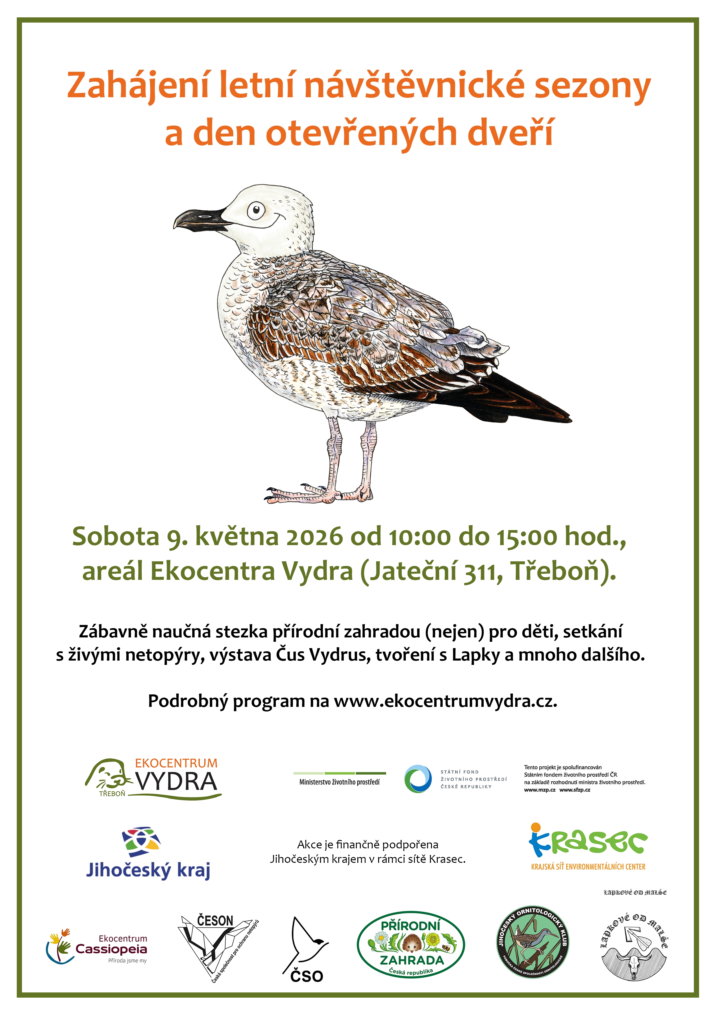 Večerní vycházka za zvířecími obyvateli Zlína [15. července 2023] Sraz na náměstí ul. Masarykova v Malenovicích (před kulturním střediskem) v 19:30. Komentovaná exkurze pro veřejnost. Pozorování rorýsů, jiřiček a dalších druhů městských ptáků na hnízdištích, představení různých aktivit ochrany městských ptáků (při zateplování budov, před kolizemi se skly, mortalitou na sloupech a drátech el. vedení apod.). Po setmění ukázky moderních metod používaných při výzkumu a praktické ochraně netopýrů (batdetektory), ukázka hendikepovaných netopýrů ze záchranné stanice. Kapacita omezena – nutné se předem přihlásit e-mailem vedoucímu exkurze (s uvedením telefonického kontaktu a počtu účastníků). Pořádáno ve spolupráci s OŽP MM Zlína. Exkurzi povedou: Evžen Tošenovský (777 771 196, tosenovsky@birdlife.cz) a Libuše Bartolčicová (577 630 982, libusebartolcicova@zlin.eu). Akce je spolufinancována SFŽP ČR na základě rozhodnutí ministra životního prostředí. Pozvánka Za zvířecími sousedy – rorýsi, jiřičky a netopýři v Soběslavi [14. července 2023] Sraz v 19:00 hod., Soběslav, Blatské muzeum – Rožmberský dům. Pozorování synantropních druhů ptáků a netopýrů (pomocí ultrazvukových detektorů), seznámení s jejich biologií a problematikou ochrany, ukázka handicapovaných netopýrů. S sebou doporučujeme dalekohled. Exkurzi povedou RNDr. Petra Schnitzerová, Ph.D. a Mgr. Miroslav Bažant. Pořádáno ve spolupráci s Blatským muzeem v Soběslavi. Akce je spolufinancována SFŽP ČR na základě rozhodnutí ministra životního prostředí. Pozvánka