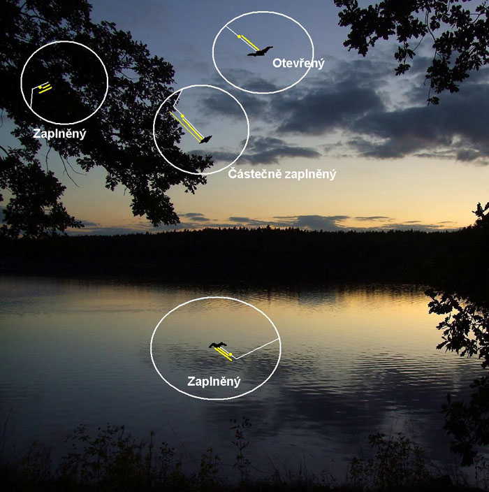 Obr.1. Typy loveckého prostoru (s použitím fotografie V.Káni & M.Maláče). Bílá čára znázorňuje signál vysílaný netopýrem, žlutá tečka s čárou ozvěnu odraženou od kořisti, žlutá čára ozvěnu odraženou od překážek.