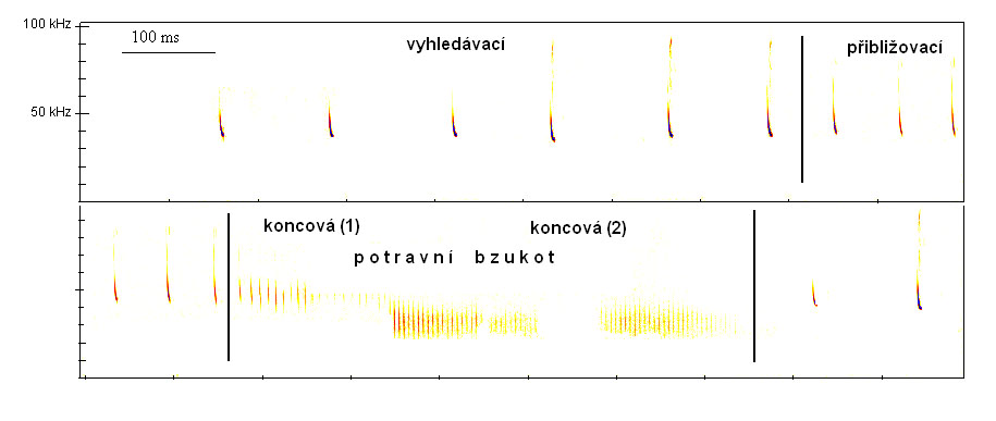 Obr. 2. Jednotlivé fáze lovu Pipistrellus kuhli; lov u lamp.