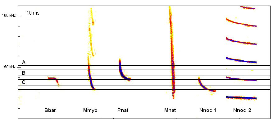 Obr 3. Výstup z ultrazvukového detektoru se systémem HET nastaveného na určité frekvence, zobrazený na sonogramu originálních signálů (ze systému TE). Zjednodušíme-li situaci a popíšeme-li kvasikonstantní (vodorovnou) část signálu, která je v HET detektorech slyšet bublavě citoslovcem „žbluňk“ a frekvenčně modulovanou (svislou) část signálu na poslech připomínající úder „tik“, budou v detektoru HET slyšet v případě A (50 kHz): tik(slabě mmyo)-tik(pnat)-tik(mnat), B (40 kHz): žbluňk(bbar)-tik(mmyo)-žbluňk(pnat)- tik(mnat)-tik(velmi slabě nnoc1)-žbluňk(2.harmonický nnoc2), C (30 kHz): tik(mmyo)-tik(mnat)-krátký žbluňk(nnoc1).